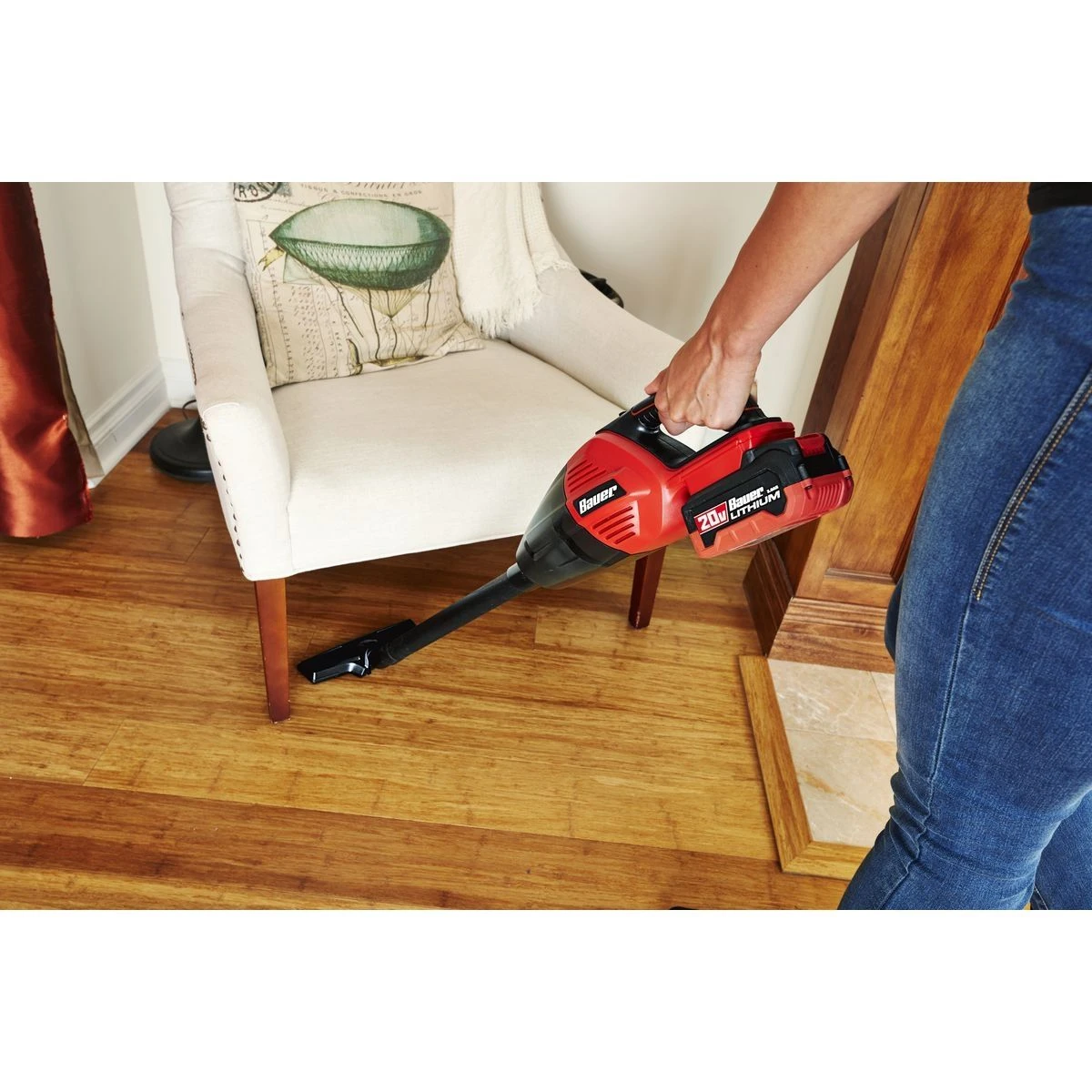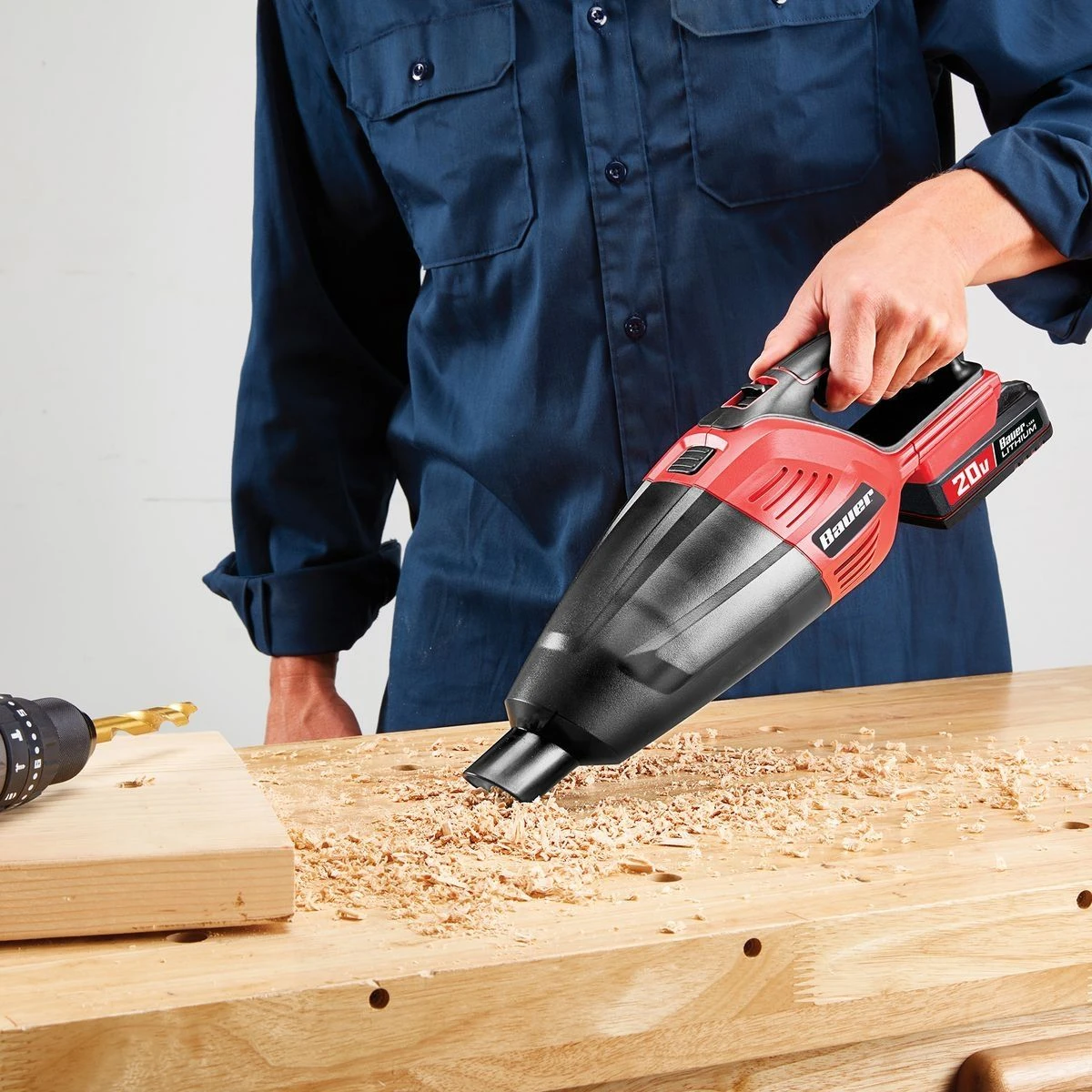 The BAUERโข 20V Cordless Hand Vacuum delivers portable, yet powerful 44 CFM suction for collecting various dust, dirt, and debris from your workshop, car or home. This cordless hand vacuum features an extended nozzle and floor brush to easily vacuum the floor while comfortably standing up. Also, includes a crevice nozzle to easily reach difficult areas, and a brush nozzle to clean delicate surfaces. The transparent debris collector easily detaches for emptying and cleaning. Ergonomic and lightweight, this powerful vacuum is ready to use in any environment for extended periods of time. Powered by BAUERโข 20V Lithium-Ion technology offering extended battery life and run-time (sold separately)