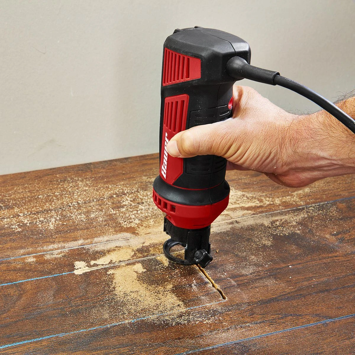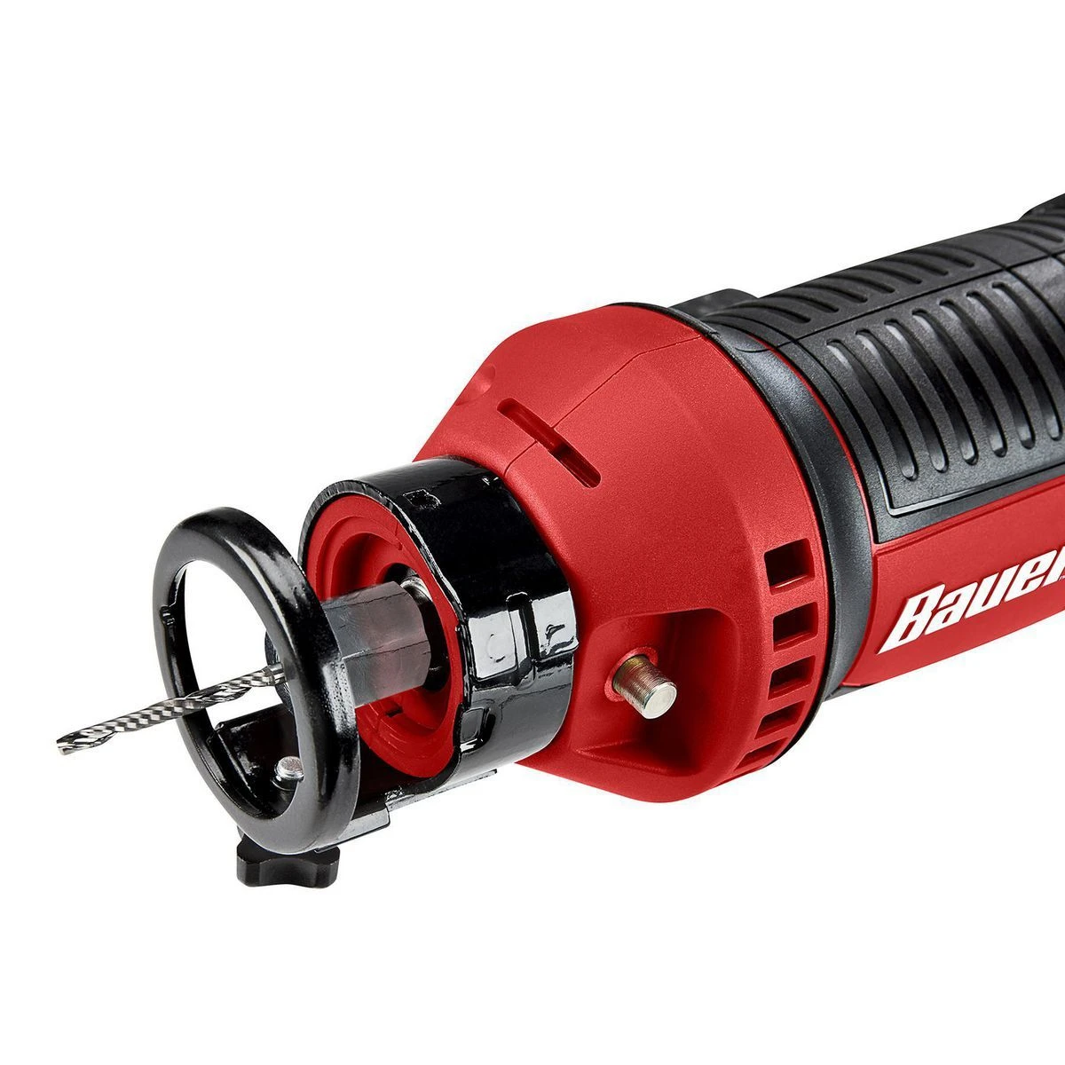 The BAUERโข 5.5 Amp Cut-out Tool has a high speed 5.5 amp motor for fast, clean cuts in drywall, plywood, cement board, and laminate. The high speed steel spiral bit cuts wood up to 1 in. deep with adjustable depth adjustment for shallower cuts. The tool comes with three collet sizes to match bits to the application. The electric cutout tool has a high impact housing and dust resistant switches for superior protection and durability.